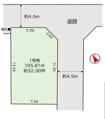 | 土地面積 | 105.81㎡(32.00坪) | 接道 | 北東側(公道)幅 約4.0m 南東側(私道)幅 約4.5m(位置指定) |